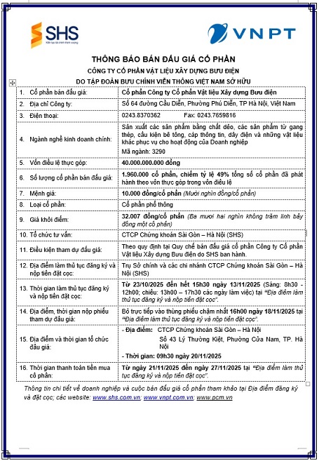 Tập đoàn Bưu chính Viễn thông Việt Nam (VNPT) xin thông báo về việc bán đấu giá cổ phần tại Công ty Cổ phần Thanh toán Điện tử VNPT do VNPT làm chủ sở hữu.