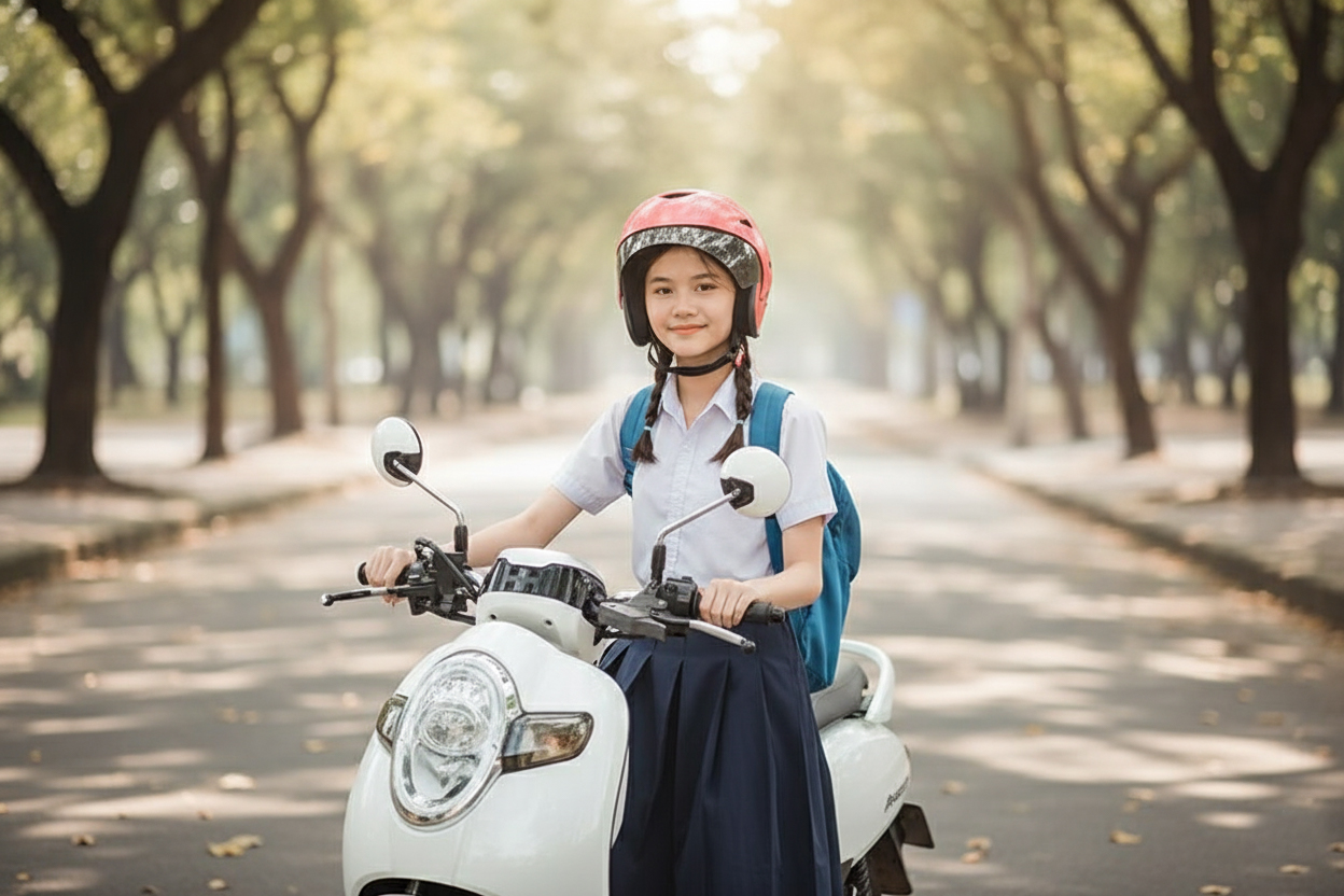 Nỗi lo đầu tiên chính là an toàn khi con cầm lái. Học sinh cấp 3 hay sinh viên năm nhất chưa có nhiều kinh nghiệm xử lý tình huống. Một chiếc xe quá to, vận tốc cao hoặc khó điều khiển dễ khiến trẻ lúng túng. Vì vậy, kiểu dáng xe điện cần gọn nhẹ, trọng tâm thấp, yên vừa tầm để học sinh dễ chống chân, giữ thăng bằng và làm chủ tay lái. Những mẫu xe step-through hay scooter nhỏ gọn thường phù hợp, giúp trẻ dễ điều khiển, hạn chế rủi ro.