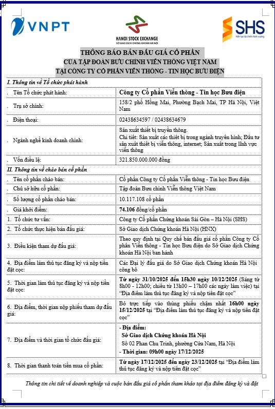Tập đoàn Bưu chính Viễn thông Việt Nam (VNPT) xin thông báo về việc bán đấu giá cổ phần tại Công ty Cổ phần Viễn thông – Tin học Bưu điện do VNPT làm chủ sở hữu.