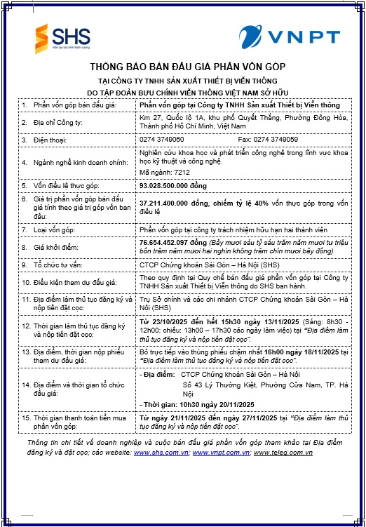 Thông báo bán đấu giá phần vốn góp tại Công ty TNHH sản xuất thiết bị Viễn thông