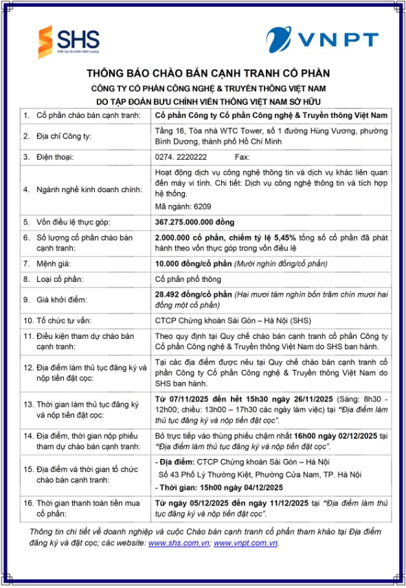 Tập đoàn Bưu chính Viễn thông Việt Nam (VNPT) xin thông báo về việc chào bán cạnh tranh cổ phần tại Công ty Cổ phần Công nghệ và Truyền thông Việt Nam do VNPT sở hữu.