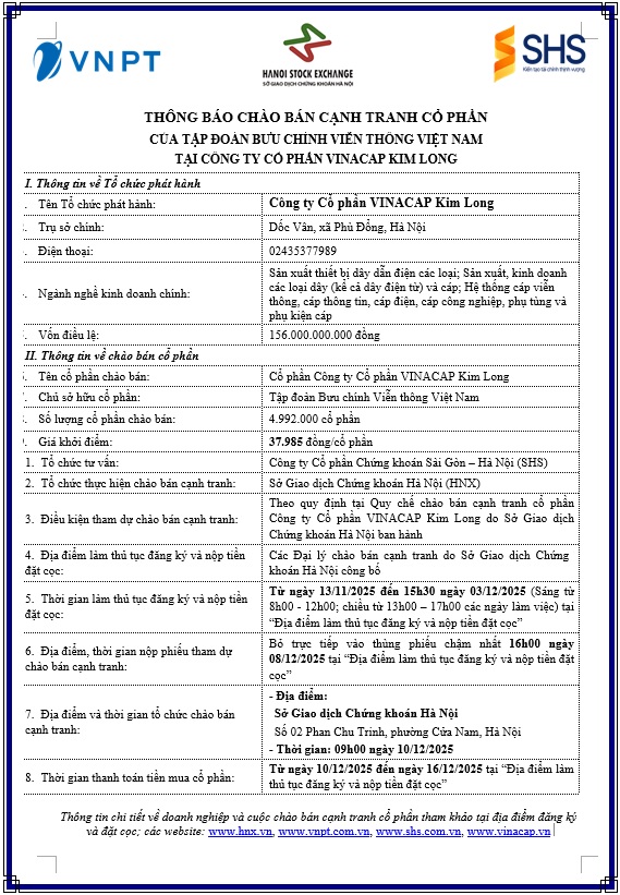 Tập đoàn Bưu chính Viễn thông Việt Nam (VNPT) xin thông báo về việc chào bán cạnh tranh cổ phần tại Công ty Cổ phần VINACAP Kim Long do VNPT sở hữu.