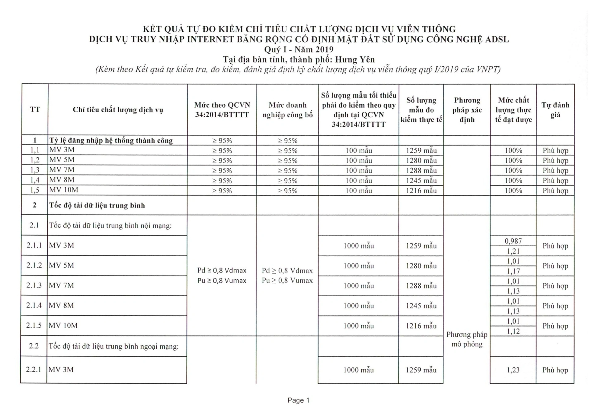 Tập đoàn Bưu chính Viễn thông Việt Nam (VNPT) công bố Kết quả tự đo kiểm chỉ tiêu chất lượng dịch vụ viễn thông dịch vụ truy nhập Internet băng rộng cố định mặt đất sử dụng công nghệ ADSL quý 1/2019 tại Hưng Yên.