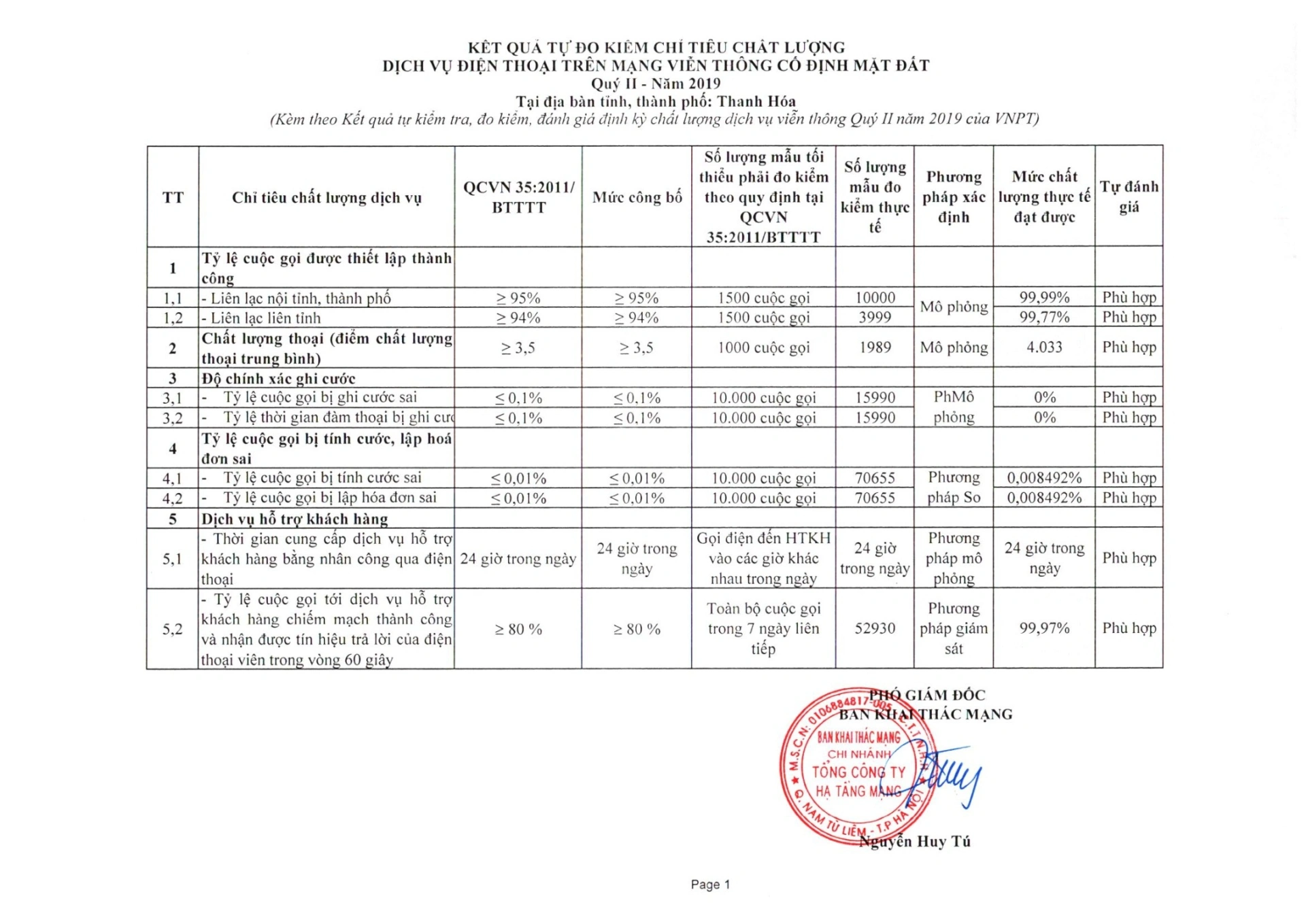 Tập đoàn Bưu chính Viễn thông Việt Nam (VNPT) công bố Kết quả tự đo kiểm chỉ tiêu chất lượng dịch vụ điện thoại trên mạng viễn thông cố định mặt đất quý 2/2019 tại Thanh Hóa.
