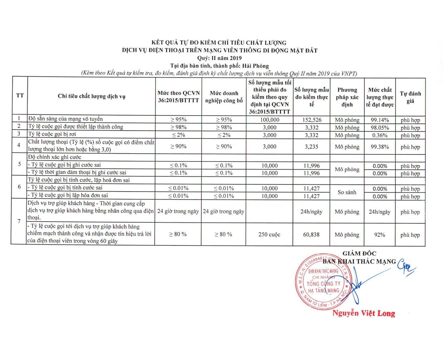 Tập đoàn Bưu chính Viễn thông Việt Nam (VNPT) công bố Kết quả tự đo kiểm chỉ tiêu chất lượng – Dịch vụ điện thoại trên mạng viễn thông di động mặt đất quý 2/2019 tại Hải Phòng.