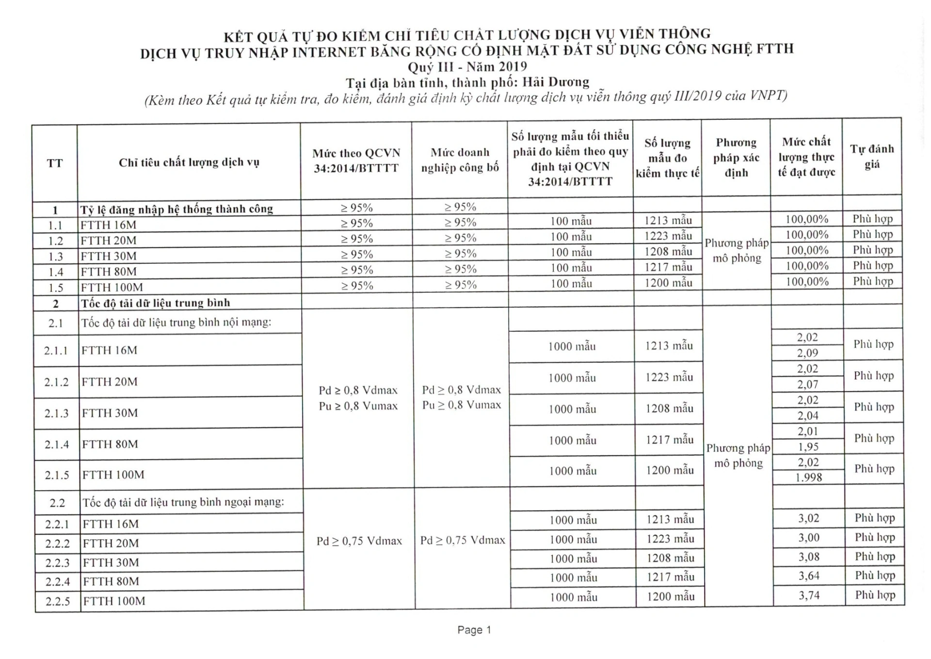 Tập đoàn Bưu chính Viễn thông Việt Nam (VNPT) công bố Kết quả tự đo kiểm chỉ tiêu chất lượng dịch vụ viễn thông dịch vụ truy nhập Internet băng rộng cố định mặt đất sử dụng công nghệ FTTH quý 3/2019 tại Hải Dương.
