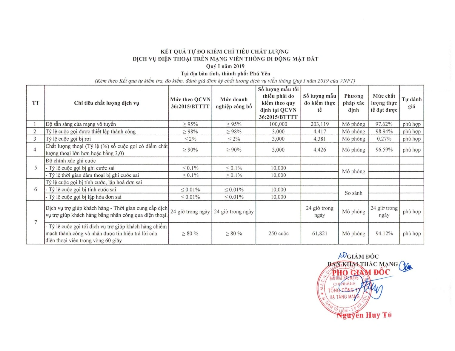 Tập đoàn Bưu chính Viễn thông Việt Nam (VNPT) công bố Kết quả tự đo kiểm chỉ tiêu chất lượng – Dịch vụ điện thoại trên mạng viễn thông di động mặt đất quý 1/2019 tại Phú Yên.