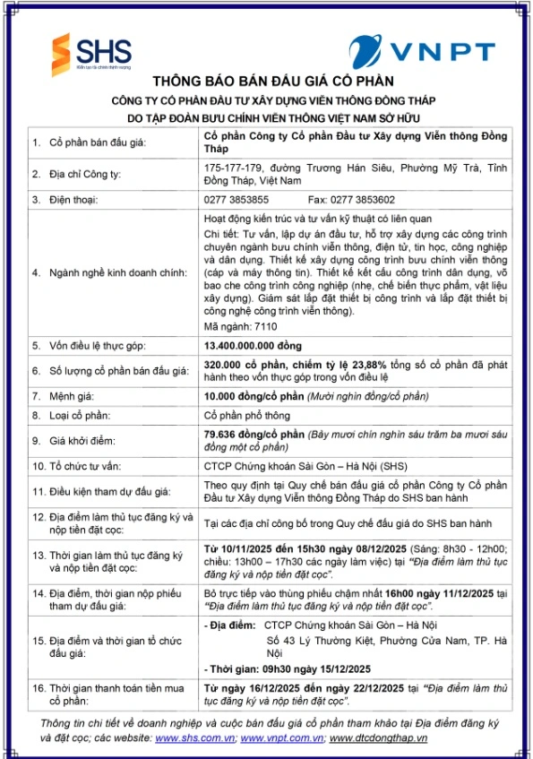 Tập đoàn Bưu chính Viễn thông Việt Nam (VNPT) xin thông báo về việc bán đấu giá cổ phần tại Công ty Cổ phần Đầu tư Xây dựng Viễn thông Đồng Tháp do VNPT sở hữu.