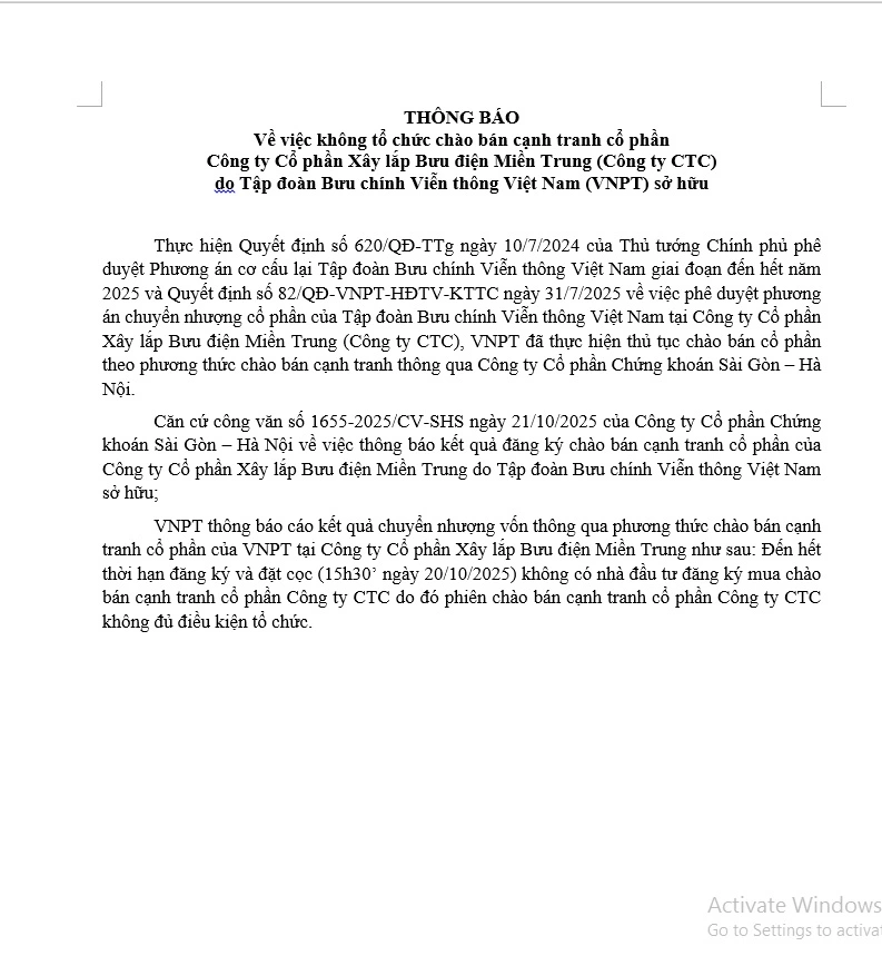 Tập đoàn Bưu chính Viễn thông Việt Nam (VNPT) xin thông báo về việc không tổ chức chào bán cạnh tranh cổ phần tại Công ty Cổ phần Xây lắp Bưu điện Miền Trung (Công ty CTC) do VNPT sở hữu.