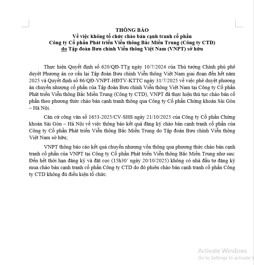 Tập đoàn Bưu chính Viễn thông Việt Nam (VNPT) xin thông báo về việc không tổ chức chào bán cạnh tranh cổ phần tại Công ty Cổ phần Phát triển Viễn thông Bắc Miền Trung (Công ty CTD) do VNPT sở hữu.