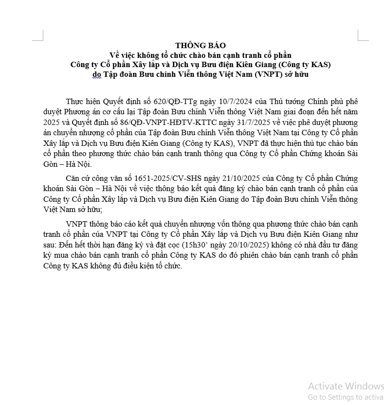 Tập đoàn Bưu chính Viễn thông Việt Nam (VNPT) xin thông báo về việc không tổ chức chào bán cạnh tranh cổ phần tại Công ty Cổ phần Xây lắp và Dịch vụ Bưu điện Kiên Giang (Công ty KAS) do VNPT sở hữu.