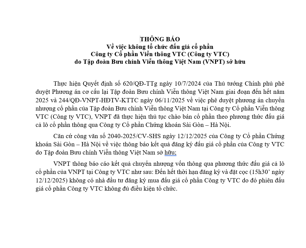 Tập đoàn Bưu chính Viễn thông Việt Nam (VNPT) xin thông báo về việc không tổ chức đấu giá cổ phần tại Công ty Cổ phần Viễn thông VTC (Công ty VTC) do VNPT sở hữu.