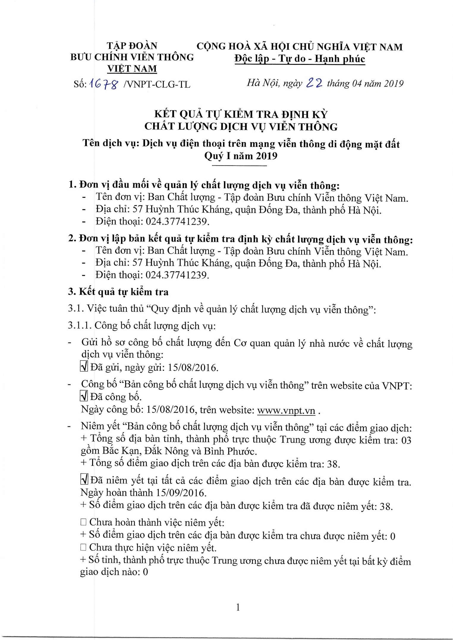 Tập đoàn Bưu chính Viễn thông Việt Nam (VNPT) công bố Kết quả tự kiểm tra định kỳ dịch vụ điện thoại trên mạng viễn thông di động mặt đất quý 1/2019.