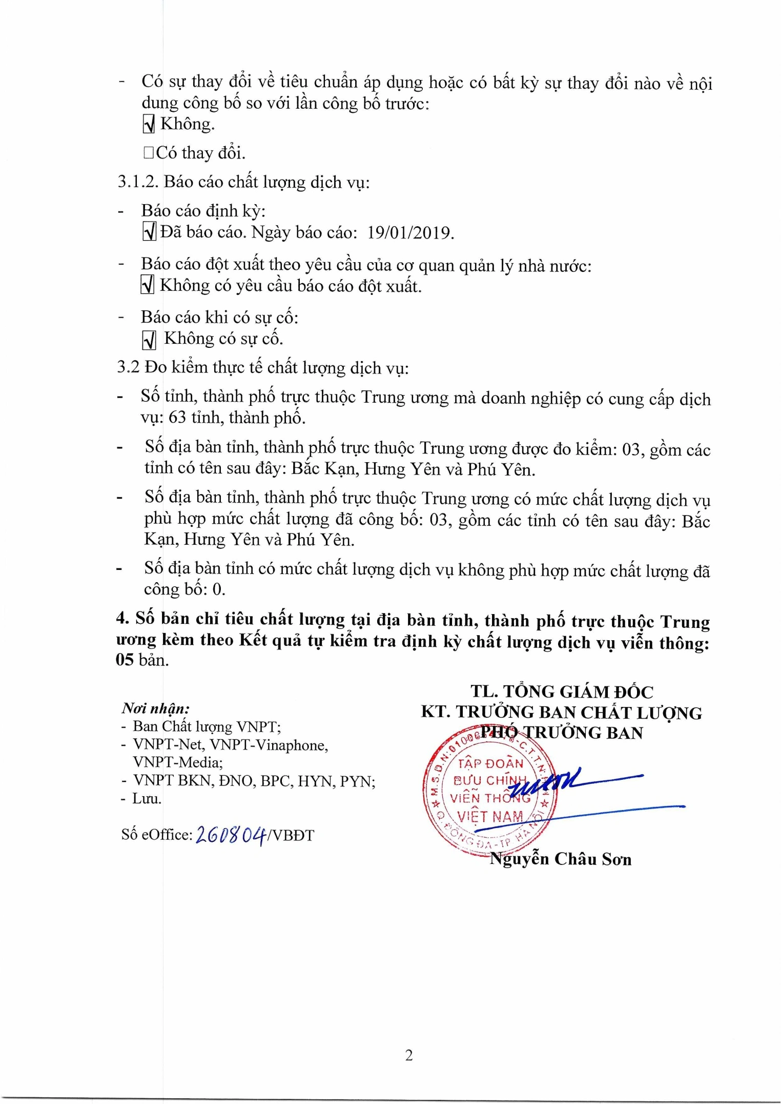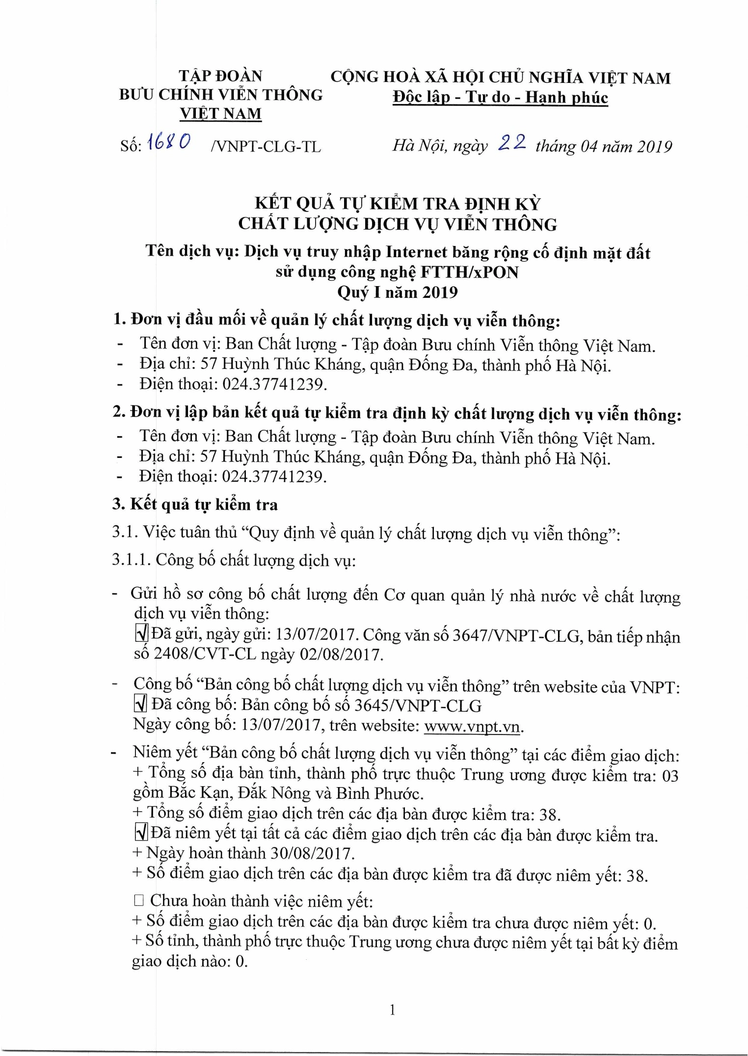 Tập đoàn Bưu chính Viễn thông Việt Nam (VNPT) công bố Kết quả tự kiểm tra định kỳ Dịch vụ truy nhập Internet băng rộng cố định mặt đất sử dụng công nghệ FTTH/xPON quý 1/2019.