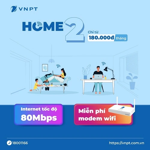 Gói Home 2 tại Hà Nội có giá từ 180 ngàn đồng - 210 ngàn đồng /tháng (đã bao gồm VAT). Với ưu đãi tốc độ tối đa trong nước 80 Mbps, miễn phí modem Wifi.