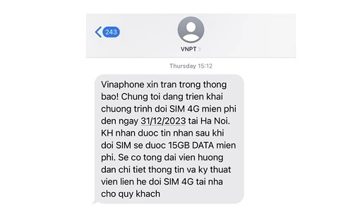 Trước hết, VNPT Hà Nội sẽ thực hiện thông báo tới các thuê bao được hưởng ưu đãi đổi sim qua tin nhắn SMS Brandname “VNPT” nội dung "Vinaphone xin tran trong thong bao! Chung toi dang trien khai chuong trinh doi SIM 4G mien phi den ngay 31/12/2023 tai Ha Noi. KH nhan duoc tin nhan sau khi doi SIM se duoc 15GB DATA mien phi. Se co tong dai vien huong dan chi tiet thong tin va ky thuat vien lien he doi SIM 4G tai nha cho quy khach".