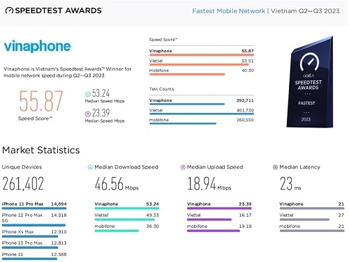 Đây là kết quả được Speedtest tiến hành tính toán dựa trên những lượt đo kiểm do chính những người dùng sử dụng các mạng viễn thông lớn tại Việt Nam thực hiện đo kiểm, đánh giá bằng thời gian thực thông qua ứng dụng Speedtest trên nền tảng iOS và Android. Kết quả này cũng không có nhiều bất ngờ khi liên tục trong 3 quý đầu năm 2023 (Quý I, Quý II và Quý III), mạng di động VinaPhone liên tục đạt được điểm số tốc độ cao nhất trên thị trường Việt Nam, tương đương 55.87 điểm.