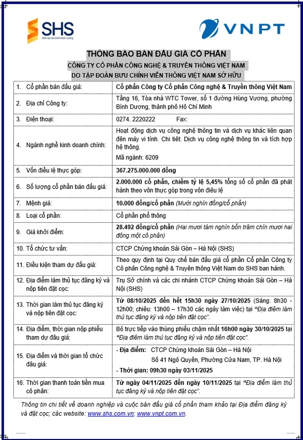 Tập đoàn Bưu chính Viễn thông Việt Nam (VNPT) xin trân trọng thông báo về việc bán đấu giá cổ phần tại Công ty Cổ phần Công nghệ và Truyền thông Việt Nam do VNPT làm chủ sở hữu. Xem thông tin chi tiết tại đây.