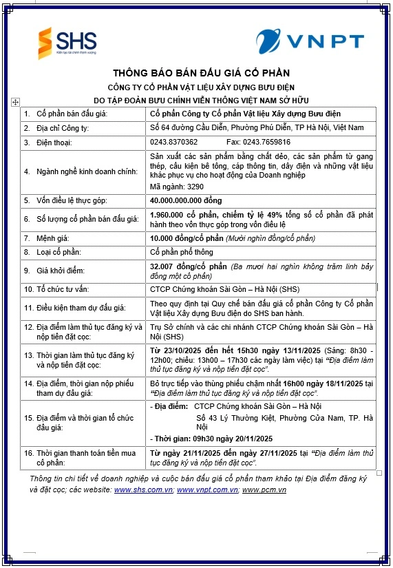 Tập đoàn Bưu chính Viễn thông Việt Nam (VNPT) xin thông báo về việc tổ chức bán đấu giá cổ phần tại Công ty CP Vật liệu xây dựng Bưu điện do VNPT là chủ sở hữu.