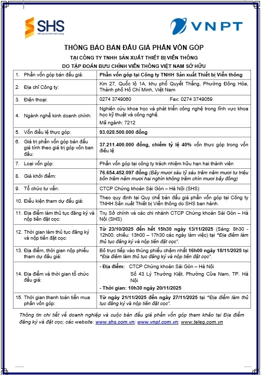 Tập đoàn Bưu chính Viễn thông Việt Nam (VNPT) xin thông báo về việc bán vốn góp tại Công ty TNHH sản xuất thiết bị Viễn thông do VNPT là chủ sở hữu.
