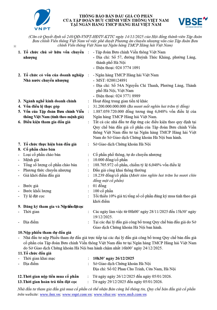 Tập đoàn Bưu chính Viễn thông Việt Nam (VNPT) xin thông báo về việc bán đấu giá cổ phần tại Ngân hàng TMCP Hàng Hải Việt Nam do VNPT sở hữu.
