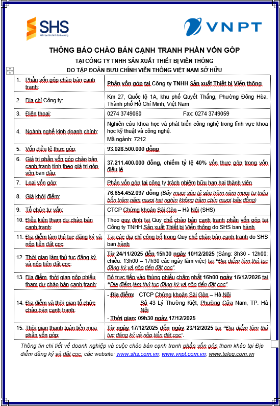 Tập đoàn Bưu chính Viễn thông Việt Nam (VNPT) xin thông báo về việc chào bán cạnh tranh phần vốn góp tại Công ty TNHH sản xuất thiết bị Viễn thông do VNPT sở hữu.