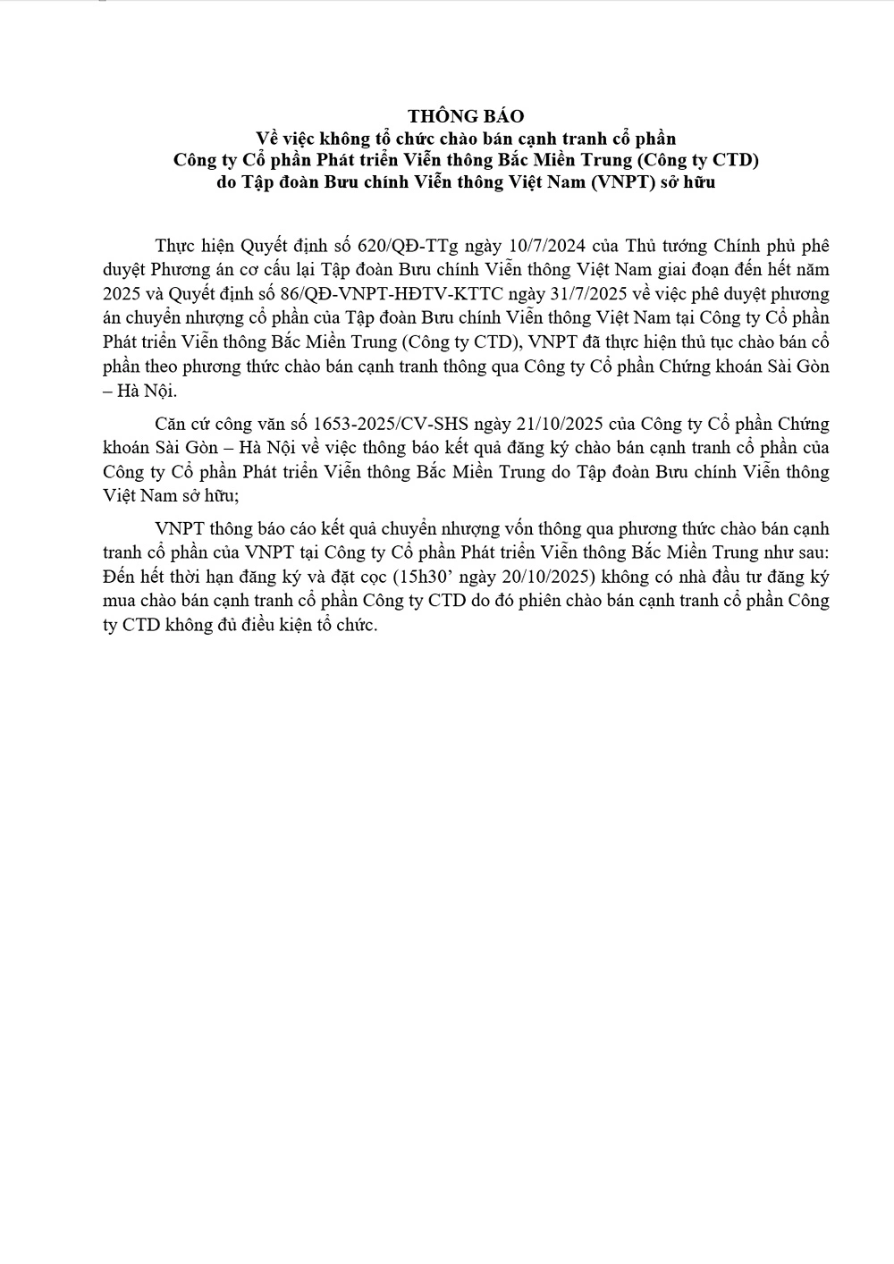 Tập đoàn Bưu chính Viễn thông Việt Nam (VNPT) xin thông báo về việc không tổ chức chào bán cạnh tranh cổ phần tại Công ty Cổ phần Phát triển Viễn thông Bắc Miền Trung (Công ty CTD) do VNPT sở hữu.