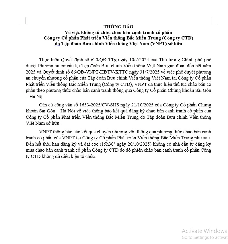 Tập đoàn Bưu chính Viễn thông Việt Nam (VNPT) xin thông báo về việc không tổ chức chào bán cạnh tranh cổ phần tại Công ty Cổ phần Phát triển Viễn thông Bắc Miền Trung (Công ty CTD) do VNPT sở hữu.