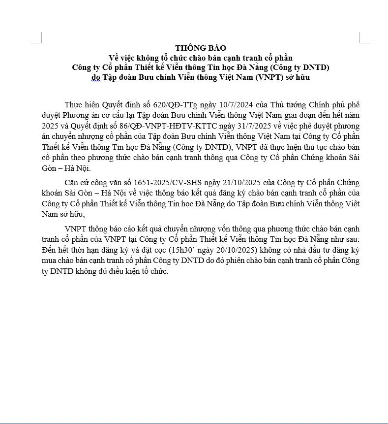 Tập đoàn Bưu chính Viễn thông Việt Nam (VNPT) xin thông báo về việc không tổ chức chào bán cạnh tranh cổ phần tại Công ty Cổ phần Thiết kế Viễn thông Tin học Đà Nẵng (Công ty DNTD) do VNPT sở hữu.