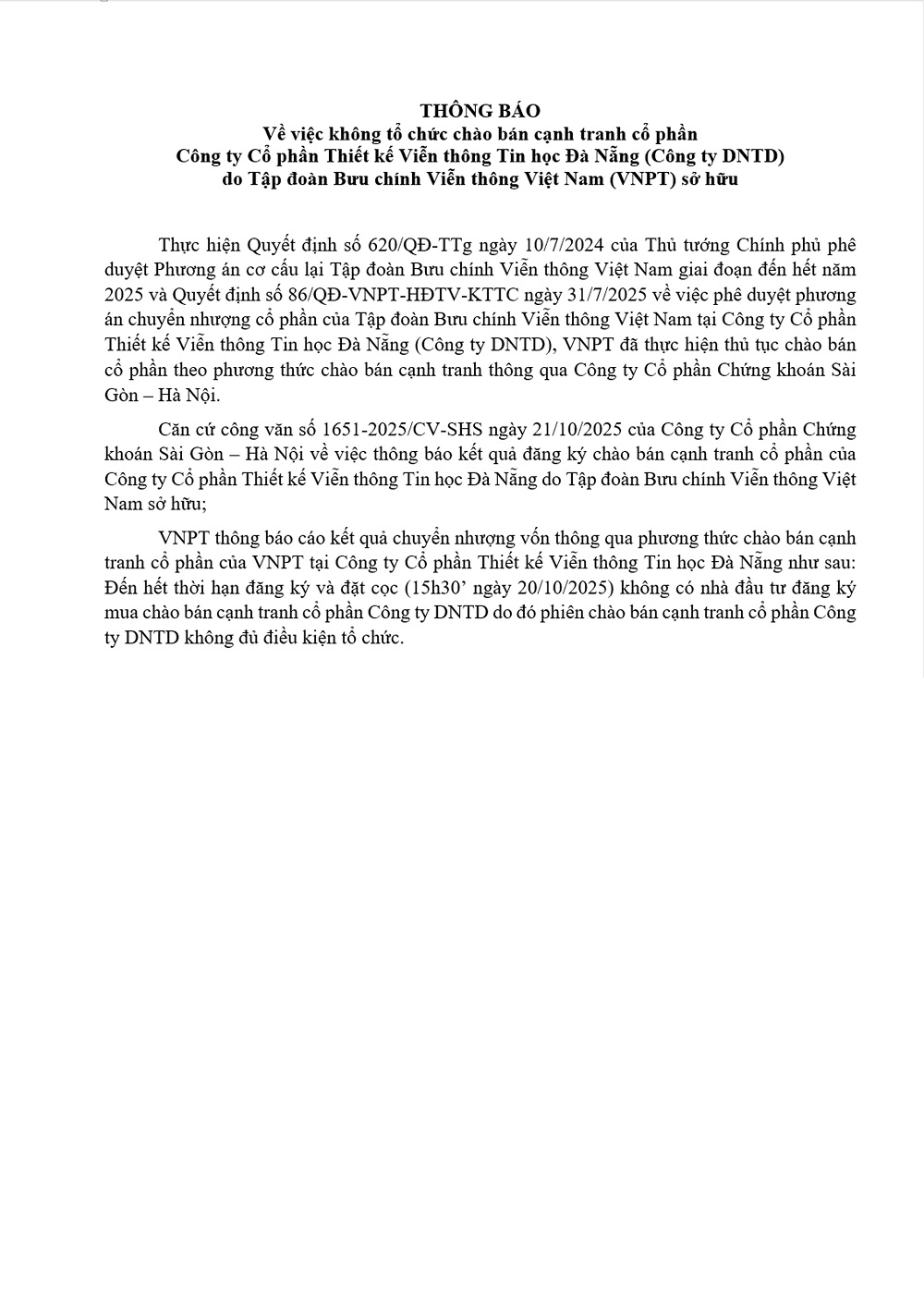 Tập đoàn Bưu chính Viễn thông Việt Nam (VNPT) xin thông báo về việc không tổ chức chào bán cạnh tranh cổ phần tại Công ty Cổ phần Thiết kế Viễn thông Tin học Đà Nẵng (Công ty DNTD) do VNPT sở hữu.