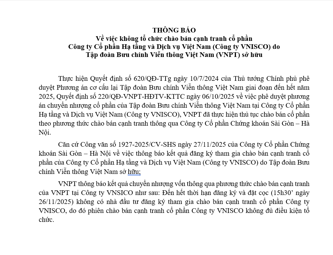 Tập đoàn Bưu chính Viễn thông Việt Nam (VNPT) xin thông báo về việc không tổ chức chào bán cạnh tranh cổ phần tại Công ty Hạ tầng và Dịch vụ Việt Nam (Công ty VNISCO) do VNPT sở hữu.