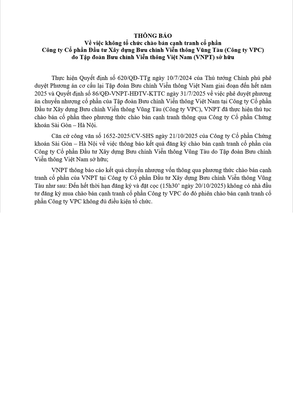 Tập đoàn Bưu chính Viễn thông Việt Nam (VNPT) xin thông báo về việc không tổ chức chào bán cạnh tranh cổ phần tại Công ty Cổ phần Đầu tư Xây dựng Bưu chính Viễn thông Vũng Tàu (Công ty VPC) do VNPT sở hữu.