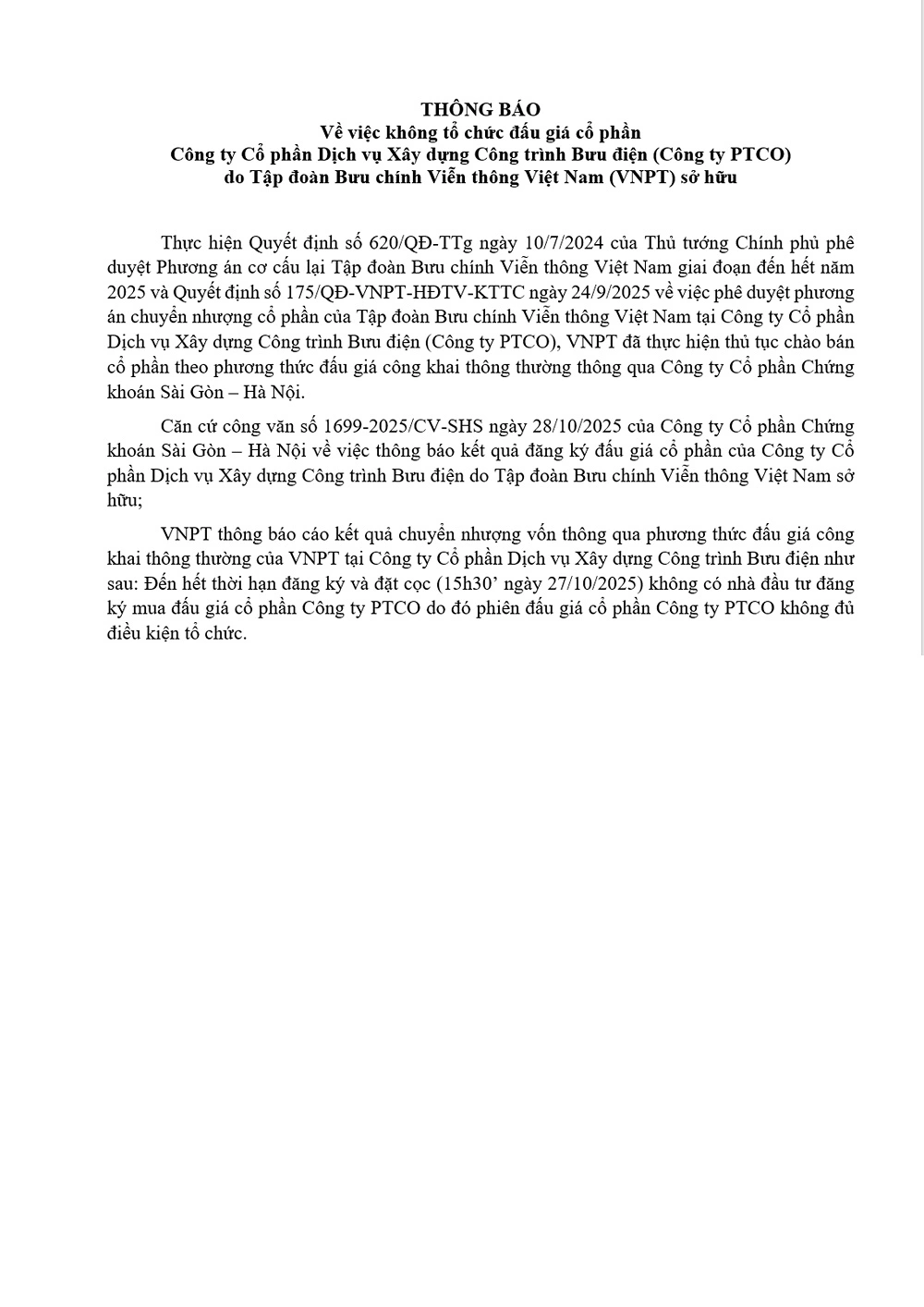 Tập đoàn Bưu chính Viễn thông Việt Nam (VNPT) xin thông báo về việc không tổ chức đấu giá cổ phần tại Công ty Cổ phần Dịch vụ Xây dựng Công trình Bưu điện (Công ty PTCO) do VNPT sở hữu.
