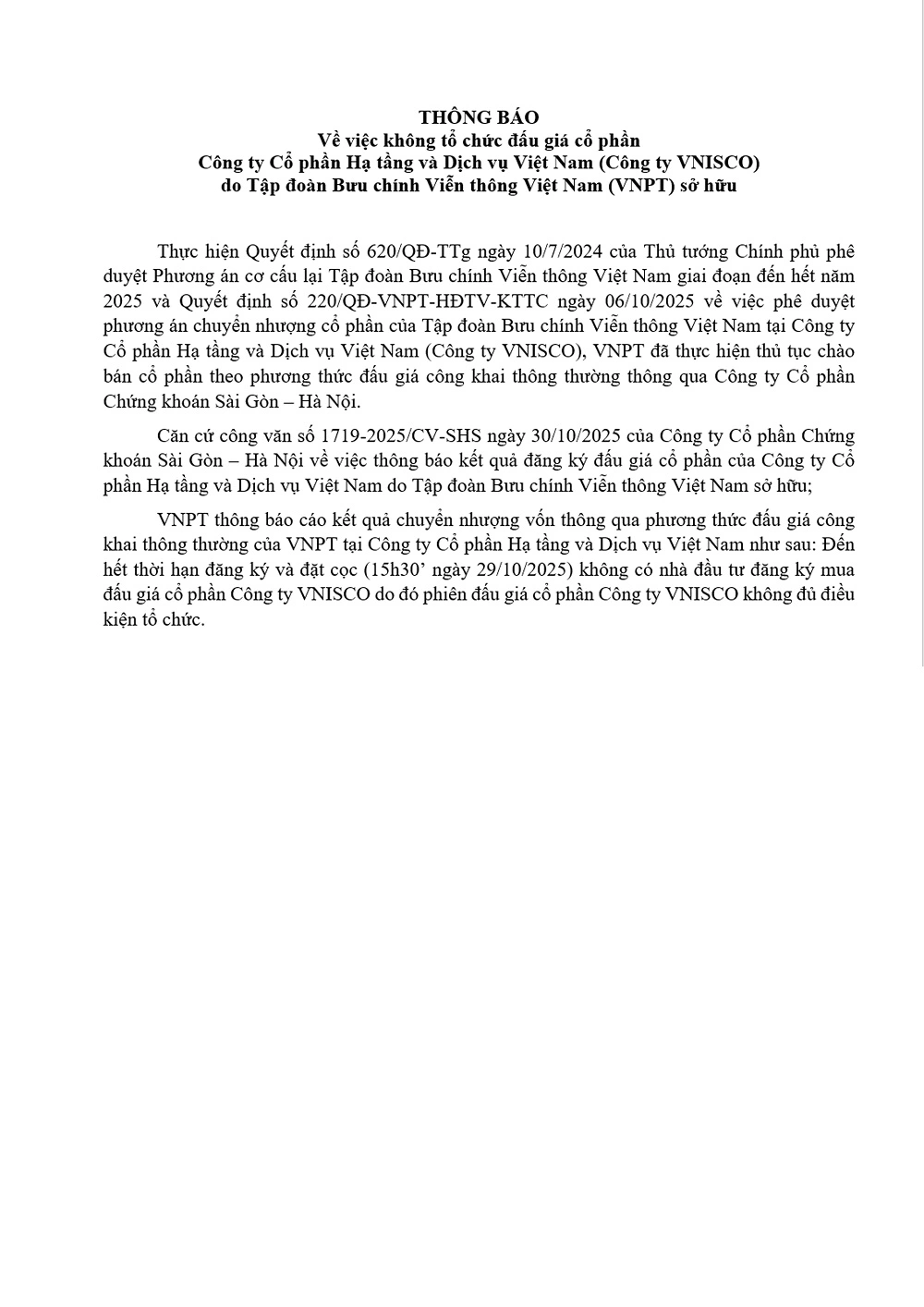Tập đoàn Bưu chính Viễn thông Việt Nam (VNPT) xin thông báo về việc không tổ chức đấu giá cổ phần tại Công ty Cổ phần Hạ tầng và Dịch vụ Việt Nam (Công ty VNISCO) do VNPT sở hữu.