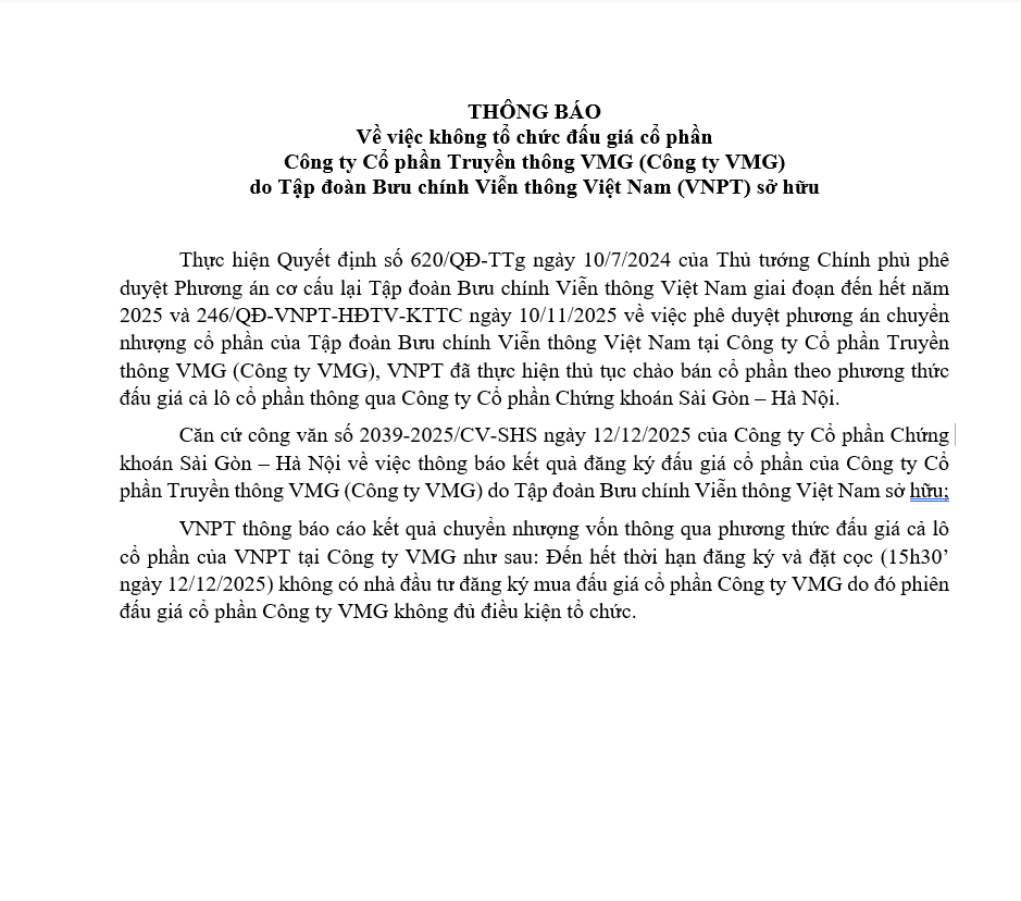 Tập đoàn Bưu chính Viễn thông Việt Nam (VNPT) xin thông báo về việc không tổ chức đấu giá cổ phần tại Công ty Cổ phần Truyền thông VMG (Công ty VMG) do VNPT sở hữu.